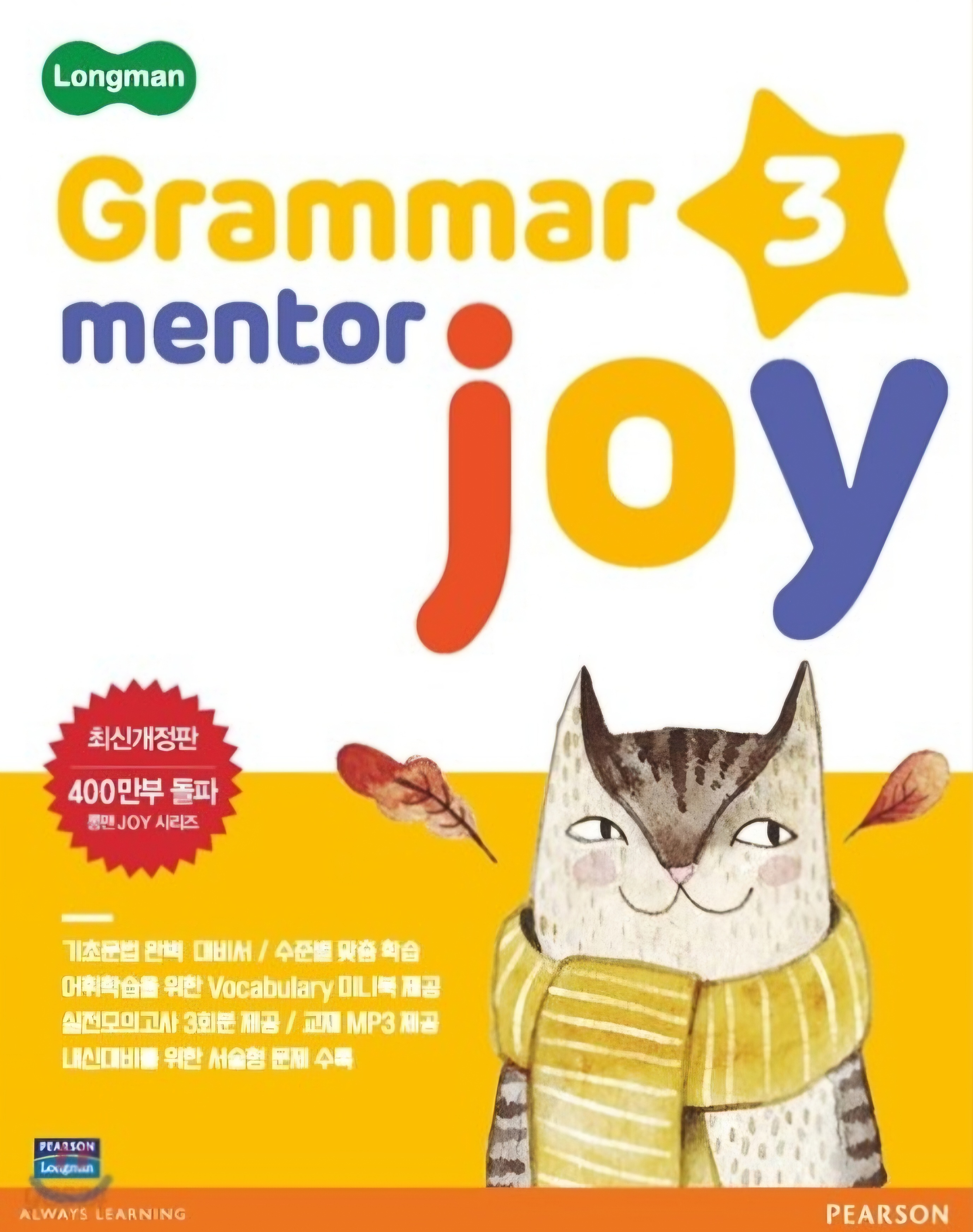 "Grammar Mentor Joy 3"은 초급에서 중급 단계로 넘어가려는 학습자들에게 적합합니다. 그멘조시리즈는 뭐니뭐니해도 반복되는 문제를 풀어나감으로써 기본 개념을 확실히 다질수 있다는 장점이 있는 교재입니다. 난이도가 높지 않아 주로 과제로 진행하고 학원에서 좀 더 어려운 수준의 문법 교재나 영작을 함께 진행하고 있어요~