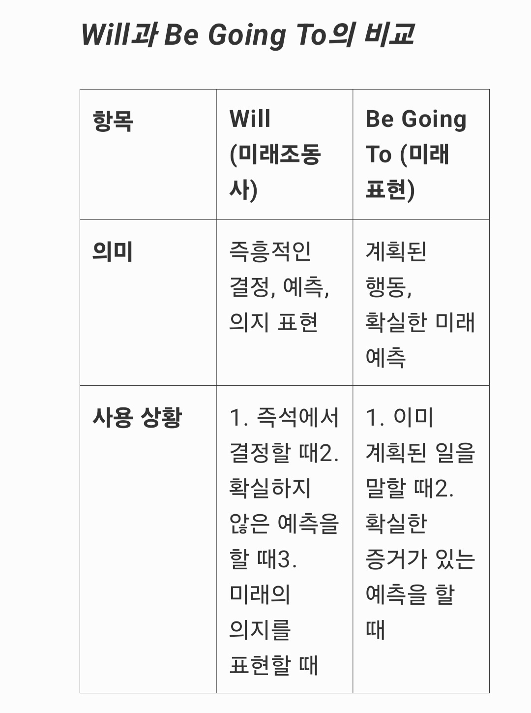 📌 너무 복잡하다고 생각한다면 'be going to'는 계획이나, 확실한 예측을 나타낸다고 기억하기!