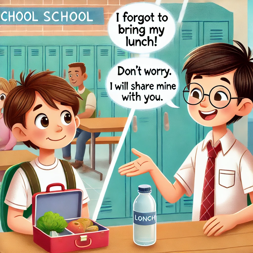 (점심 가져오는 걸 깜빡했어! / 걱정 마. 내 거 나눠줄게.)