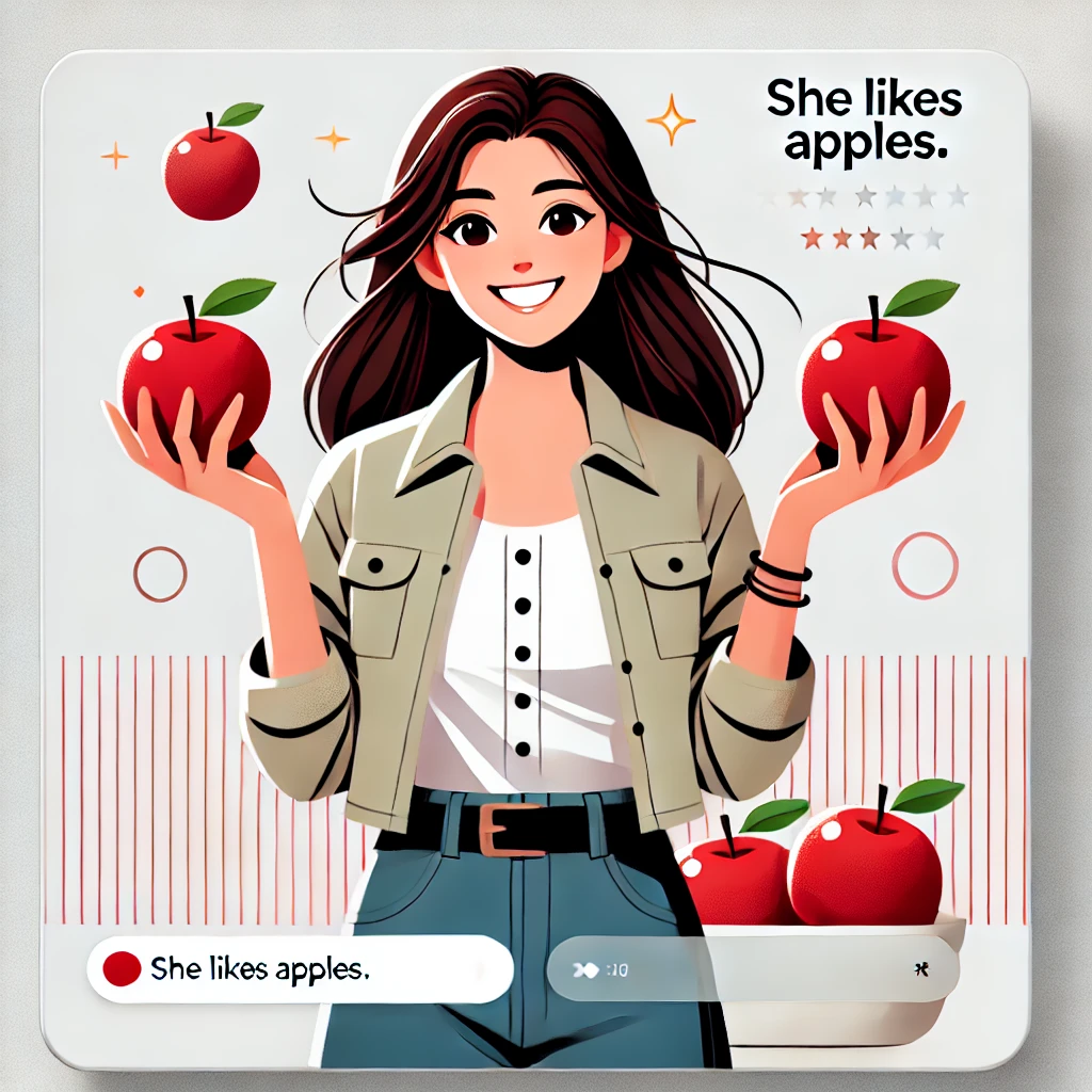 "She like apple"처럼 3인칭 단수일 때 동사에 -s를 빼먹는 실수도 흔합니다.(이건 초린이는 물론 중고등생도 종종 틀림!)
